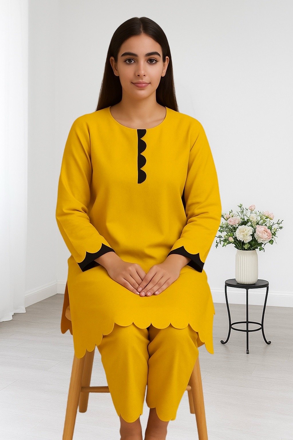 The scalloped edges and contrasting black detailing add a refined, modern touch, making this outfit versatile for casual outings, office wear, and semi-formal events.